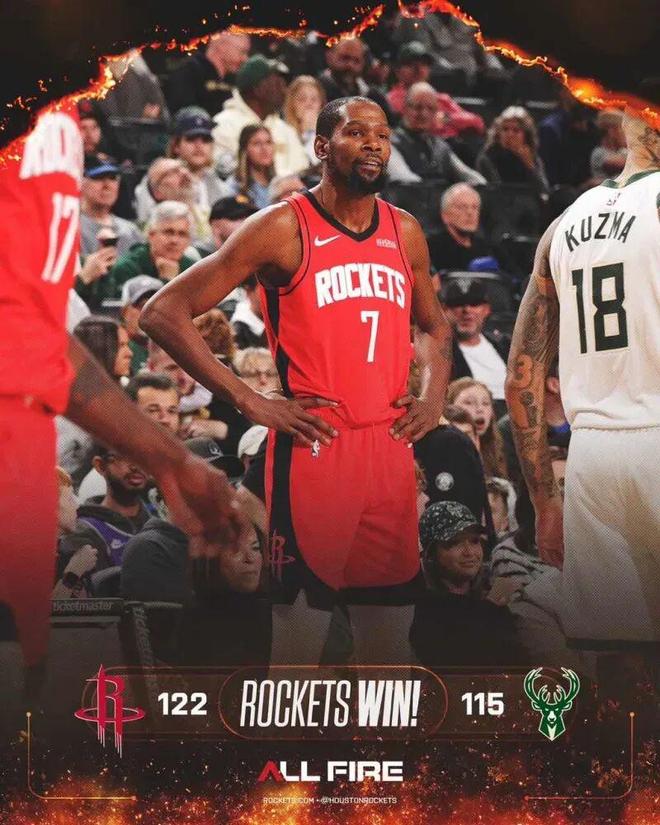 NBA战报|火箭122-115逆转雄鹿,杜兰特31分7助,字母哥37分8板